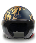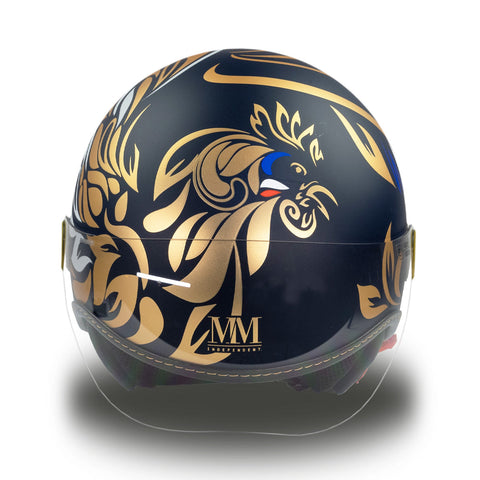 O capacete independente do Jet MM é renovado em uma versão azul esplêndida, embelezada com acabamentos exclusivos de ouro Chrometech e enriquecida pelos detalhes característicos que distinguem os capacetes da linha MM. Pendurado em três variantes de cores, branco, azul e preto.